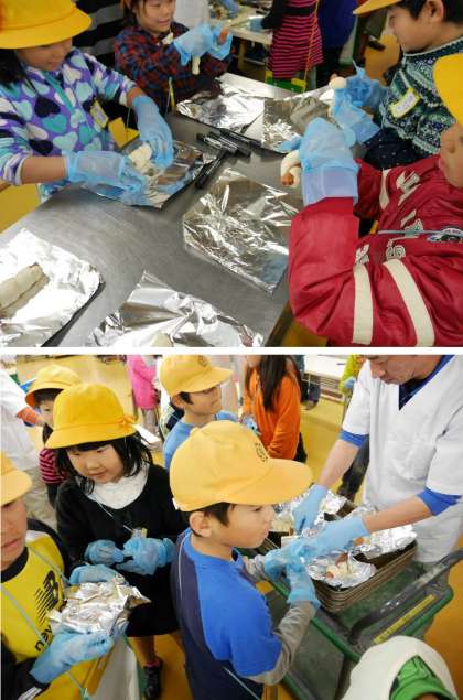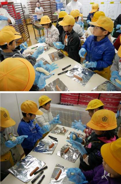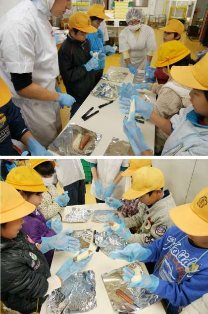 パン工場で、フランクフルトに生地を伸ばしてまきつけて、パンづくりの体験をしました。もちもちの生地がなかなかのびないので苦労している子もいました。個性のあるそれぞれのパンができました。