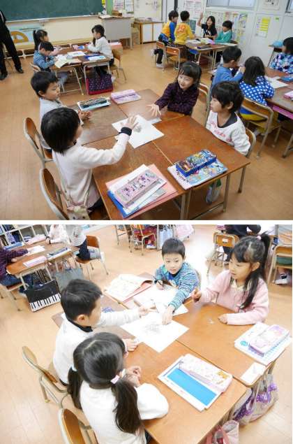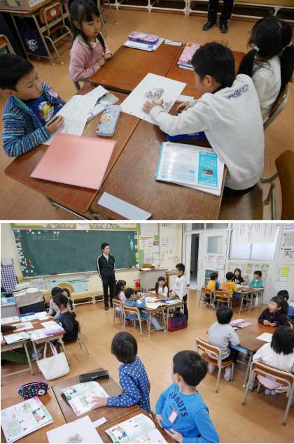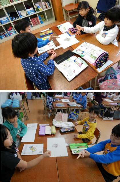 1年生がグループになって、クリップの数をかぞえています。じゃんけんでかったらクリップをもらえます。さて、なんこのクリップがとれたかな。ぱっとみて、わかるように、どのようにならべたらいいかな。さあ、みんなで考えよう。