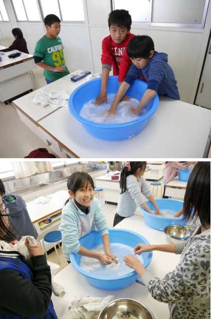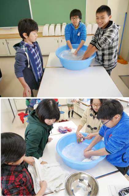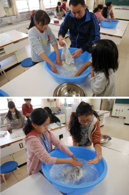 6年生が大きなたらいにお湯と洗剤をいれて、体操服を洗濯する実習をしています。洗剤液の量を計算して、手で洗ってしぼって、水ですすいで干します。今は洗濯機があるから自動で洗濯してくれるけど、昔の人は大変だったんだね。自分で洗濯の工程を確認しながら体験してみると、洗濯の仕組みがよくわかりますね。生活に役立つ教科です。