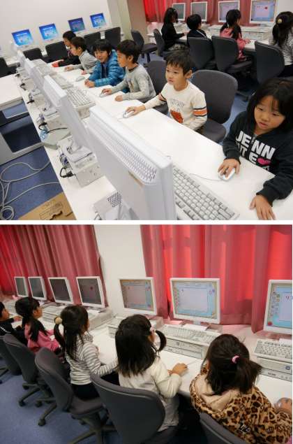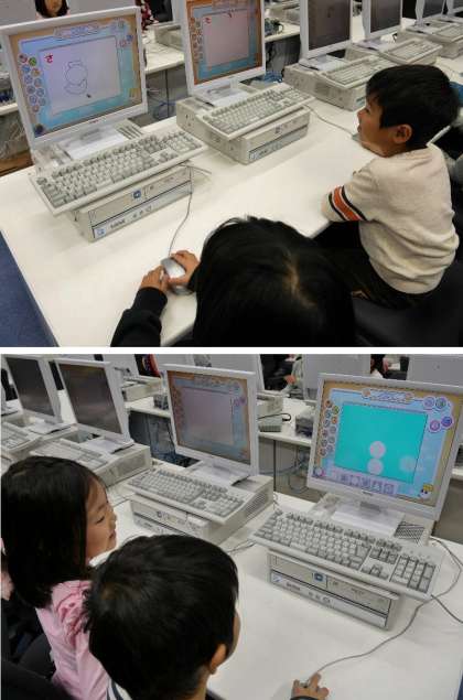 1年生がパソコンを使って絵を描いています。上手にマウスを操作して雪だるまを描いている人もいます。とても楽しそうに操作しながら実習しています。昔の授業にはなかったからうらやましいですね。