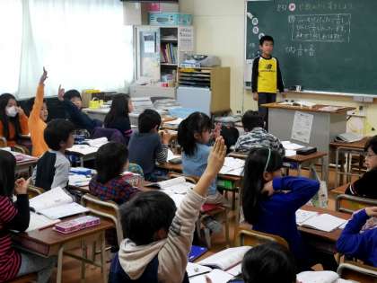 3年生の算数で、分数の計算式を説明しています。みんなからは質問があり答えています。他人に説明するのはむずかしいけど、説明できるということは、本当にわかっているということですね。