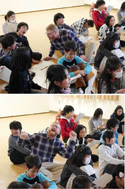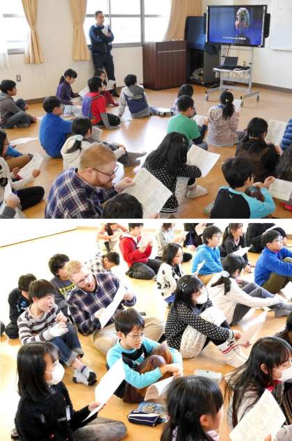 6年生は今年の映画でブレイクしたあの歌「Let it go」をみんなで熱唱しました。歌詞プリントには英語にカタカナがつけてくれてありました。動画をみながら熱唱です。たのしそうです。