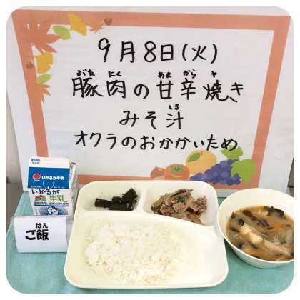 今日の献立は、豚肉の甘辛焼き・みそ汁・オクラのおかかいため・ごはん・牛乳でした。