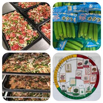 『オクラのおかかいため』は、3cm幅に切ったオクラをサラダ油でいため、調味料で味つけし、粉末かつおぶしを加えていためます。今日は高知県産のオクラを使用しています。