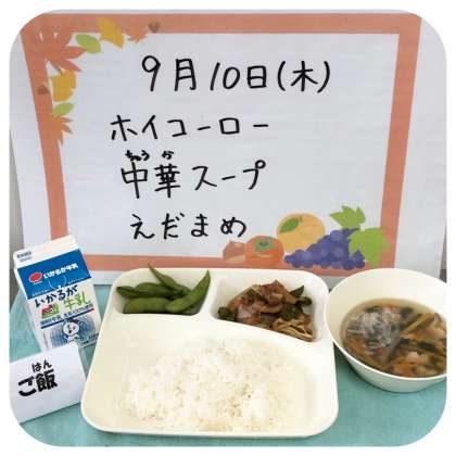 今日の献立は、ホイコウロー・中華スープ・えだまめ・ごはん・牛乳でした。