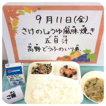 今日の献立は、さけのしょうゆ風味焼き・五目汁・高野どうふのいり煮・ごはん・牛乳でした。
