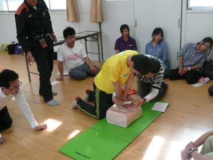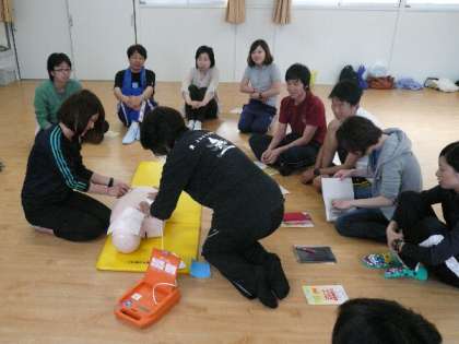 茨田北小学校と焼野小学校の先生がたが焼野小学校に集まって、鶴見消防署の方に来ていただき救急救命講習会を行いました。来月にはプールの授業も始まります。先生方も真剣に実技研修ををしています。心肺蘇生の手順を実習し、人工呼吸やAEDの操作も実習しました。焼野小学校のAEDは体育館の前に設置されています。