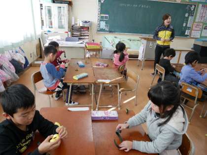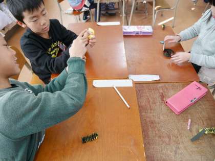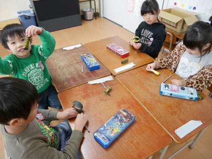 1年生が細い色画用紙を折ったり、組み合わせたり、まるめたりしていろいろなものを作っています。新しいこと発見できたかな。