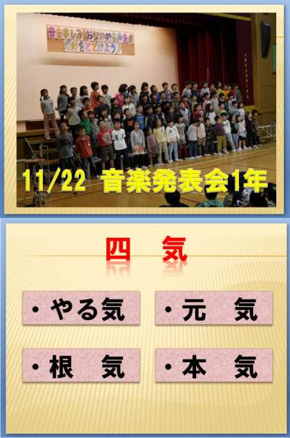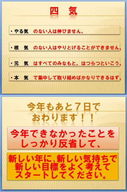 終業式のプレゼンテーションの画面の一部です。30年前にだしていた学級通信からあらためて「四気」をみんなにおくります。