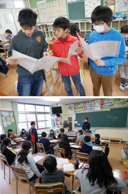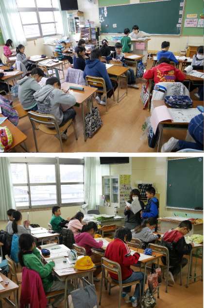 終業式のあと各学級でひとりひとりに担任の先生から通知票をいただきました。「どうだった!」とみせあっている児童もいます。また、学級で反省やよかったところなどを発表しているところもありました。