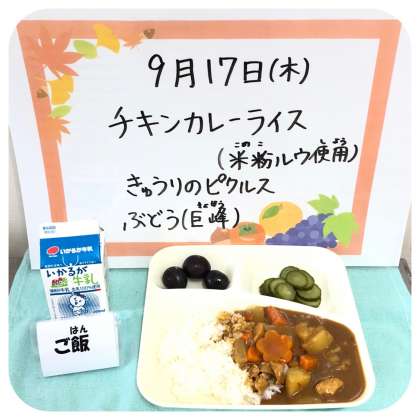 チキンカレーライス・きゅうりのピクルス・ぶどう(巨峰)・牛乳でした。