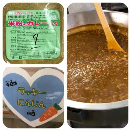 今日のカレーも、小麦粉を使用しない『米粉のカレールウ』です。型抜きで『ラッキーにんじん』を、100個作っていただきました。