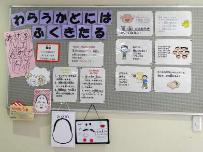 いつも楽しい保健室前の掲示板です。「笑う」ことも健康につながるんですね。ワハハハハっとふくわらいもしてみましょう!