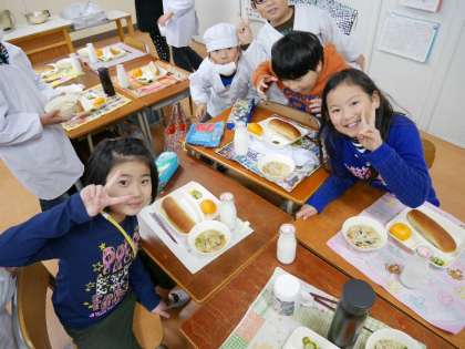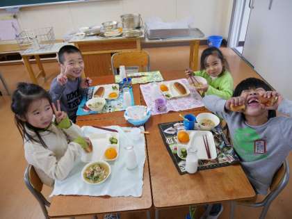 今日から給食スタート!やっぱりおいしい笑顔だね。