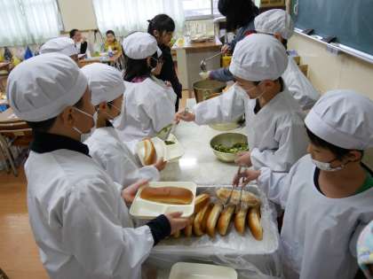 今日から3学期の給食が始まりました。今日はチャンポンときゅうりとコーンのちゅうからあえ、みかん、こくとうパンでした。おいしい笑顔で給食をいただきました。