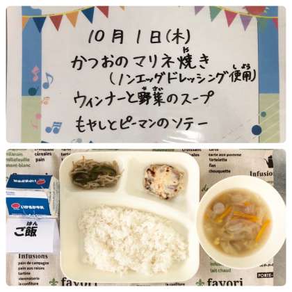 今日の献立は、かつおのマリネ焼き・ウインナーと野菜のスープ・もやしとピーマンのソテー・ごはん・牛乳でした。