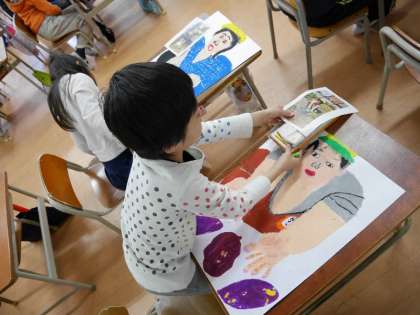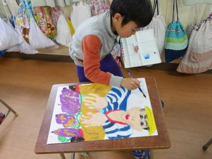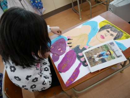 2年生のおいも堀りの自分の写真をみながらしあげた作品がいよいよ完成です。しっかりと書き込んできたので、迫力ある作品ができあがってきましたね。