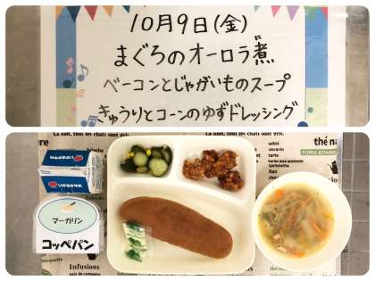 今日の献立は、まぐろのオーロラ煮・ベーコンとじゃがいものスープ・きゅうりとコーンのゆずドレッシング・コッペパン・マーガリン・牛乳でした。
