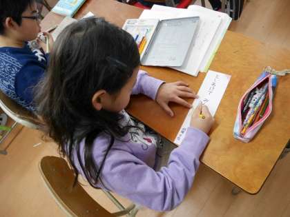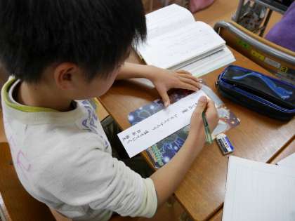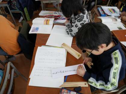 3年生の国語では俳句について学習しています。俳句は、日本で昔から作られている短い詩ですね。5・7・5で作ります。子どもたちも自分たちでつくって、カードに清書しています。「もみじの葉 ひらひらひらり 落ちていく」と、なかなか感性ゆたかな俳句をつくっていました。よく季節やものごとを見たり感じないとつくれませんね。なにげない日常の生活や風景に目をむけてみましょう。
