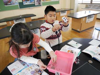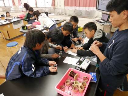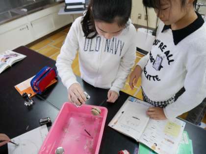 5年生が電磁石の学習をしています。電線をたくさんまきつけて電気をながすと磁石になるんですね。とても不思議ですね。クリップが電磁石についてきます。どうしてか考えてみましょう。この原理をつかっている製品が身の回りにもたくさんありますね。