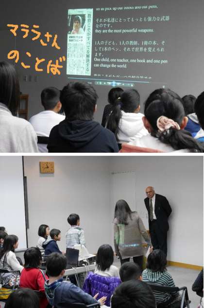 国際連合環境計画(UNEP)技術・産業・経済局(DTIE) 国際環境技術センター(IETC)の専門官のメモンさんから、国連のしくみや環境技術センターの仕事内容や環境問題についてのお話を聞きました。メモンさんはパキスタン出身なので、すべて英語でのお話です。秘書の方に通訳していただき環境について学習することができました。マララさんの国連演説のビデオをみせていただき、改めて教育の大切を知ることができました。お話のあとは質問タイムです。メモンさんへの個人的な質問にも丁寧に答えていただき、盛り上がりました。ありがとうございます。最後に学級で記念写真を撮りました。