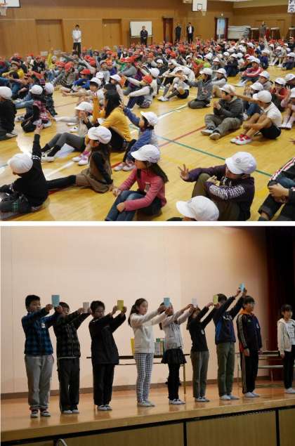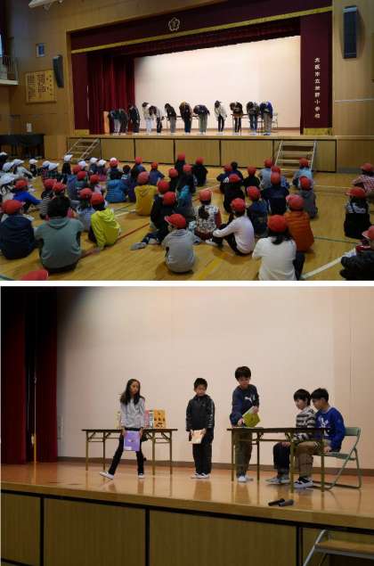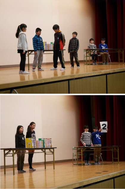 今日の児童集会では図書委員会からの発表がありました。図書委員会の活動を劇とクイズで発表してくれました。