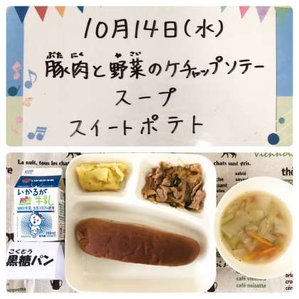 今日の献立は、豚肉と野菜のケチャップソテー・スープ・スイートポテト・黒糖パン・牛乳でした。