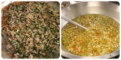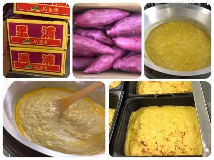 スイートポテトは、生のさつまいもから手作りしています。煮くずれるまで柔らかく煮たさつまいもに、砂糖・牛乳・クリーム・溶かしバターを加えて煮、クラスごとにミニバットに入れて焼きます。