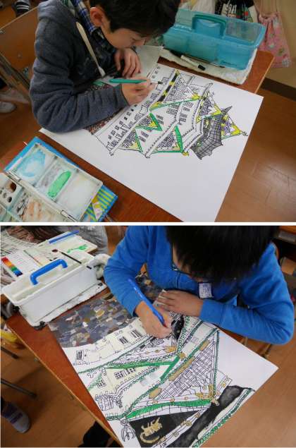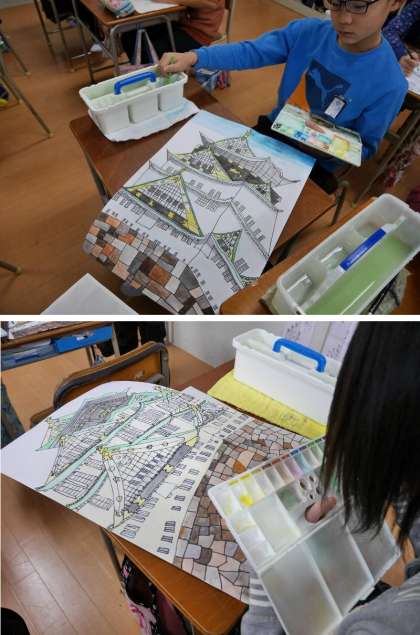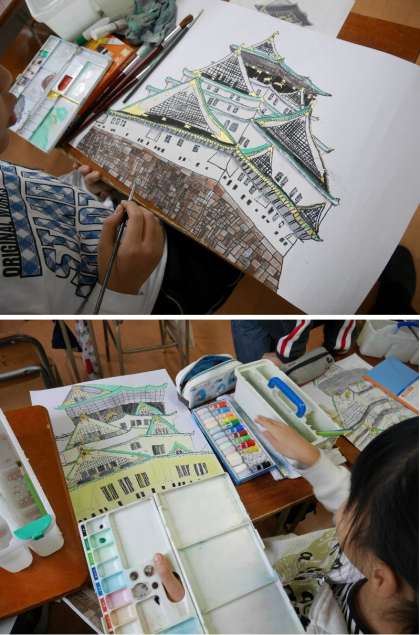6年生が大阪城の絵をしあげています。色合いを少しずつ変えて塗り、うすく影をつけたりと、リアルに仕上げるのには時間がかかります。よい作品ができあがるのが楽しみですね。