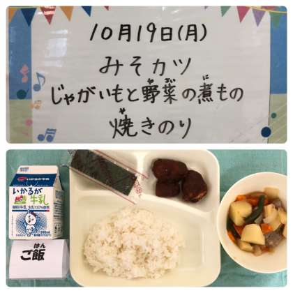 今日の献立は、みそカツ・じゃがいもと野菜の煮もの・焼きのり・ごはん・牛乳でした。