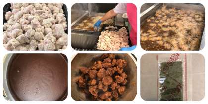 豚肉に塩・こしょうで下味をつけ、水と小麦粉を混ぜ合わせた衣、パン粉を順につけ熱した油で揚げます。衣に卵は使用していません。みそだれは、八丁みそと赤みそを合わせて食べやすい味にしています。