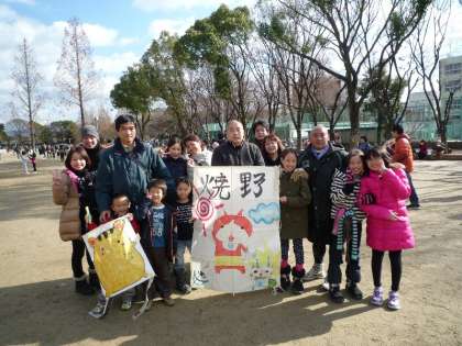 鶴見区の凧あげ大会が鶴見緑地で行われました。焼野地域でも大凧が作られて参加されていました。空高くあげるのはなかなか難しかったです。でも大人も子どもも凧あげに夢中になって楽しんでいました。