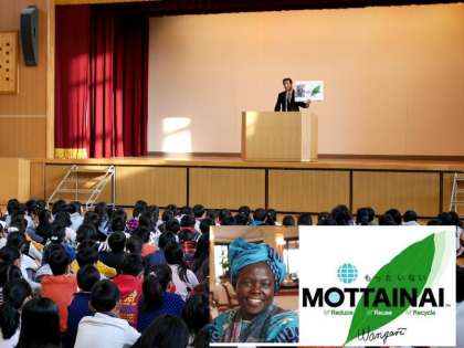また、ノーベル平和賞を2004年に受賞したワンガリー・マータイのお話をしました。アフリカのケニアの砂漠化による貧困にたちむかい、グリーンベルト運動をおこしてえ5000万本もの木を植えたマータイさんは、「今、私にできることをしているだけ」と地道な取り組みが実をむすんだのです。2005年に日本に来られた時に、日本語の「もったいない」という言葉を知り感銘をうけて、「MOTTAINAI」の言葉を世界にひろめたのです。「もったいない」という言葉が世界で通じることは、6年出前授業でも国連UNEPでも教えてもらいましたね。