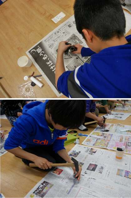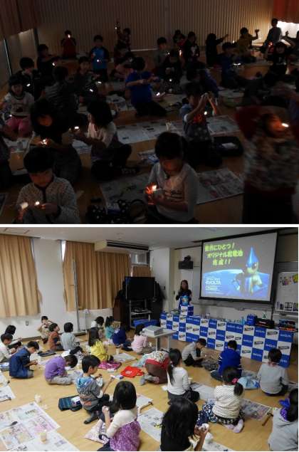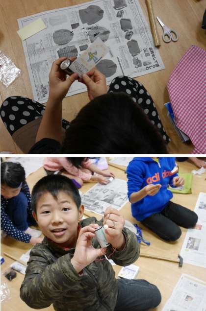 乾電池のケースに二酸化マンガンをつめて炭素棒を差し込みます。プラス極のふたをしっかりしめると完成です。豆球をつないでみると明るくひかりましたね。出来上がった乾電池をみんなで、カウントしてつけました。とてもきれいですね。