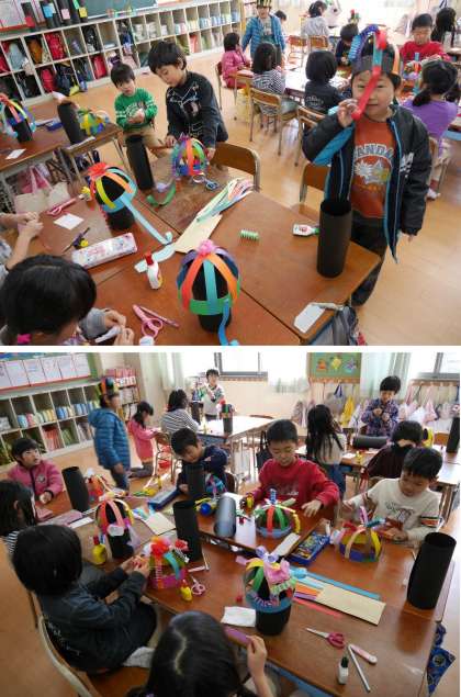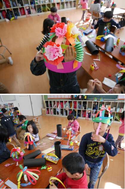 1年生は帽子の土台を作って、そこにカラフルな色画用紙をつけています。お花をつくってつけているのは女の子が多いかな。とてもすてきな帽子になりそうです。