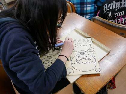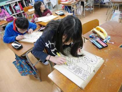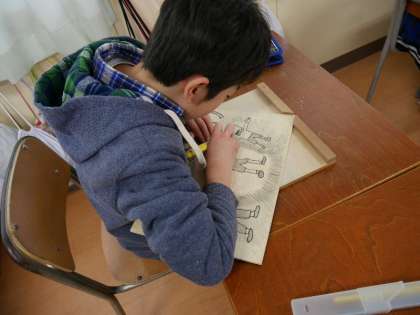 6年生が下絵を反転させて版画に写して、彫刻刀でほりこんでいっています。絵はポスターです。いろいろなメッセージが書かれていますね。