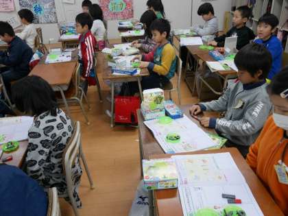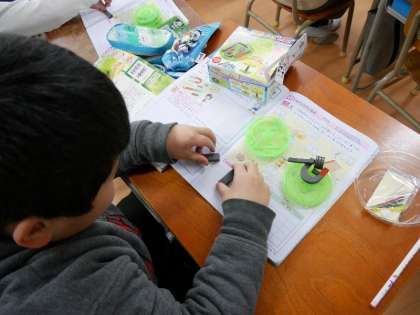 3年生が、磁石セットを使って磁石の不思議を探っています。磁石どうしを近づけてみると引き合ったり、しりぞけあったりしますね。おもしろいですね。