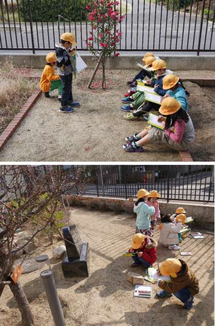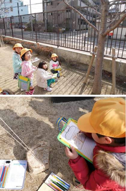 1年生が校舎のうらや池のまわりで絵をかいています。冬にさいている花や、葉がない桜の木をスケッチして冬をかんじています。