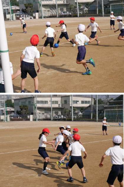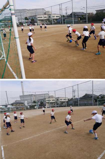 3年生が体育でサッカーをたのしんでいます。がんばれ!