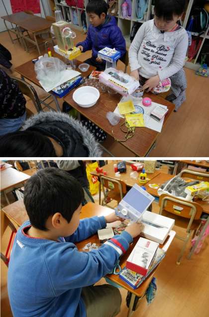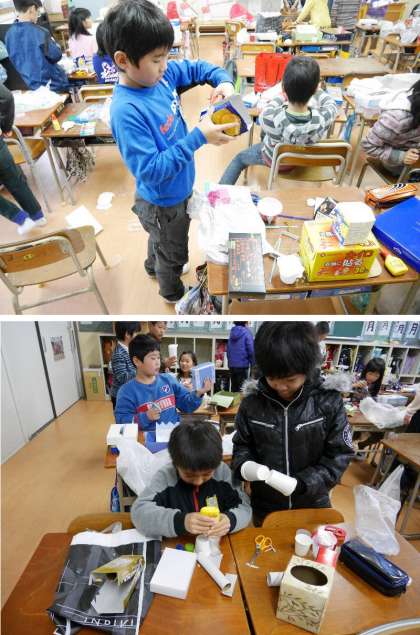 3年生が家庭からもちよった牛乳パックやおかしの箱などを利用して、切ったり、はりつけたりして、メカザウルスをつくっています。いろんな箱の形にあわせて工夫するのに頭を悩ましています。