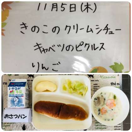 今日の献立は、きのこのクリームシチュー・キャベツのピクルス・りんご・おさつパン・牛乳でした。
