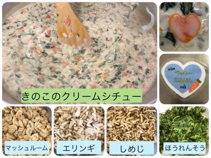 クリームシチューには、鶏肉・じゃがいも・たまねぎ・にんじんの他に、3種類のきのこと、青みにほうれんそうを使用しています。ラッキーにんじんは、各クラスに1つは必ず入っています。