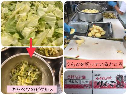 りんごは青森県産の「早生ふじ」という品種です。給食室で皮をむき、芯をとっていただいています。配缶専用エプロンと使い捨て手袋を使用し、衛生的に取り扱っています。