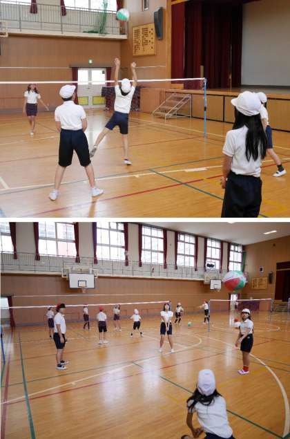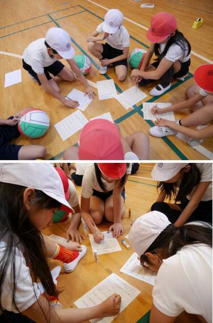 6年生の体育ではソフトバレーボールをしています。チーム力を高めるために、作戦を班でねっています。そあ練習開始だ!
