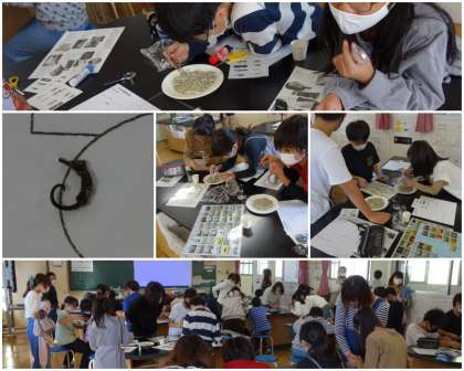 19日の授業参観で、5年1組は理科室で「総合」の学習で「ちりめんモンスターを探せ!」が行われました。