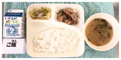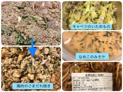 今日の献立は、鶏肉のごまだれ焼き・なめこのみそ汁・キャベツのいためもの・ごはん・牛乳でした。