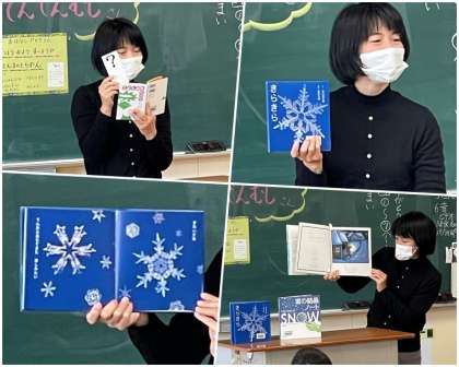 後半のブックトークでは、体をほぐしてから、最初にクイズ、続いて「雪」をテーマとした本がいくつか紹介され、最後は雪をテーマとした絵本の読み聞かせでした。