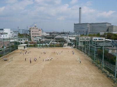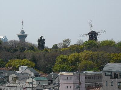 正門方面には、風車がある鶴見緑地公園が見えます。