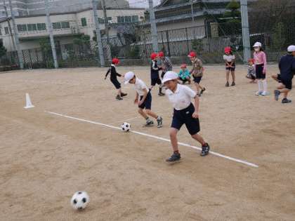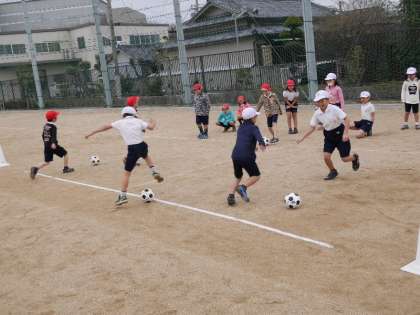 3年生の体育でも、サッカーボールの練習をしていました。ペアではなれてドリブルをして、相手にボールをわたします。強くけりすぎたらボールが飛んで行ってしまいます。ほどほどの力で、足のインサイドをつかって上手にける必要があるんですね。