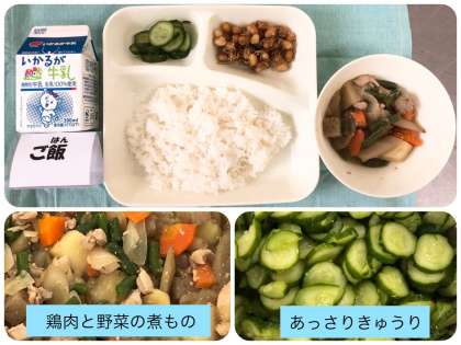 今日の献立は、鶏肉と野菜の煮もの・じゃこ豆・あっさりきゅうり・ごはん・牛乳でした。